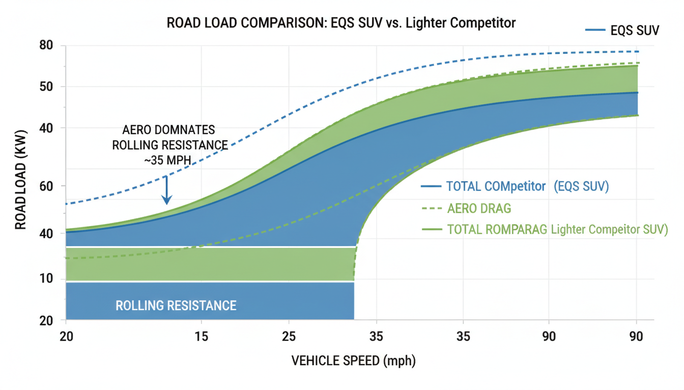 The 555 kg mass difference between the Mach-E and EQS SUV contributes only 1.5 kW of additional road load at highway speed. The aerodynamics are essentially equal. This is why the EQS SUV's highway efficiency is competitive despite the mass penalty — you cannot overcome poor Cd with light weight at highway speed.